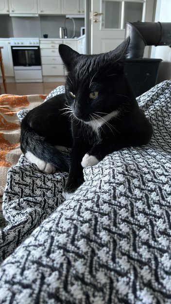 Svart med hvite sokker og hvitt underhals. Grønne/gule øynene