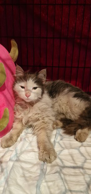 Hvit og grå langhåret. Kastrert men ikke chipet
