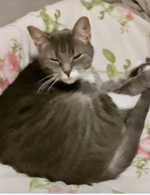 Mørk grå, sorte striper, hvitt bryst og hvite labber.