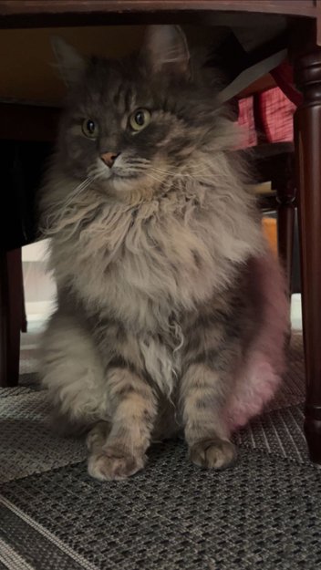 Han er langhåret med skikkelig løvemanke rundt hodet. Ganske stor katt. Gråfarget, men litt lysere områder som f.eks på magen.