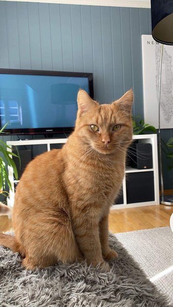 Katten er Rød-orange på hele kroppen, bortsett fra haletuppen som er hvit.