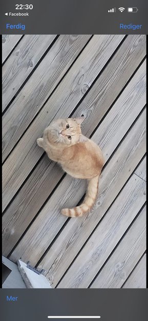 Nydelig rød katt befinner seg på utsiden hos oss på Strengereid. Den er kjempe kosen og tillitsfull. Ikke stempel i øret. Usikker på kjønn.