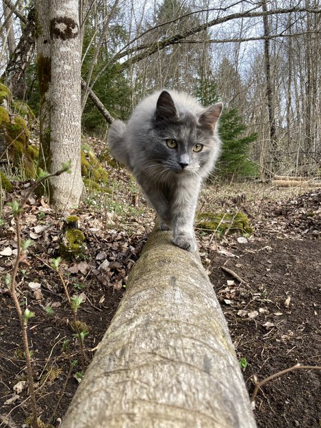 Grå fyldig pels med innslag av lys brun og hvitt. Nese er rosa og svart. Er chippet hos AniCura Rising. Rolig og kosete.