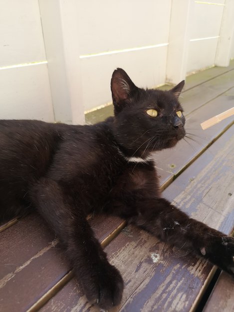 Svart, relativt ung hannkatt. Ukastrert. Litt hvitt på bryst og mage.