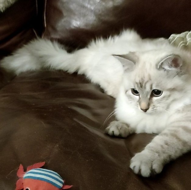 Pouffy er for det meste hvit, med grå striper i ansiktet og på potene. Halen er grå oppå. Hun er lysebrun på nesetippen og har blå øyne. Hun er veldig kjælen.