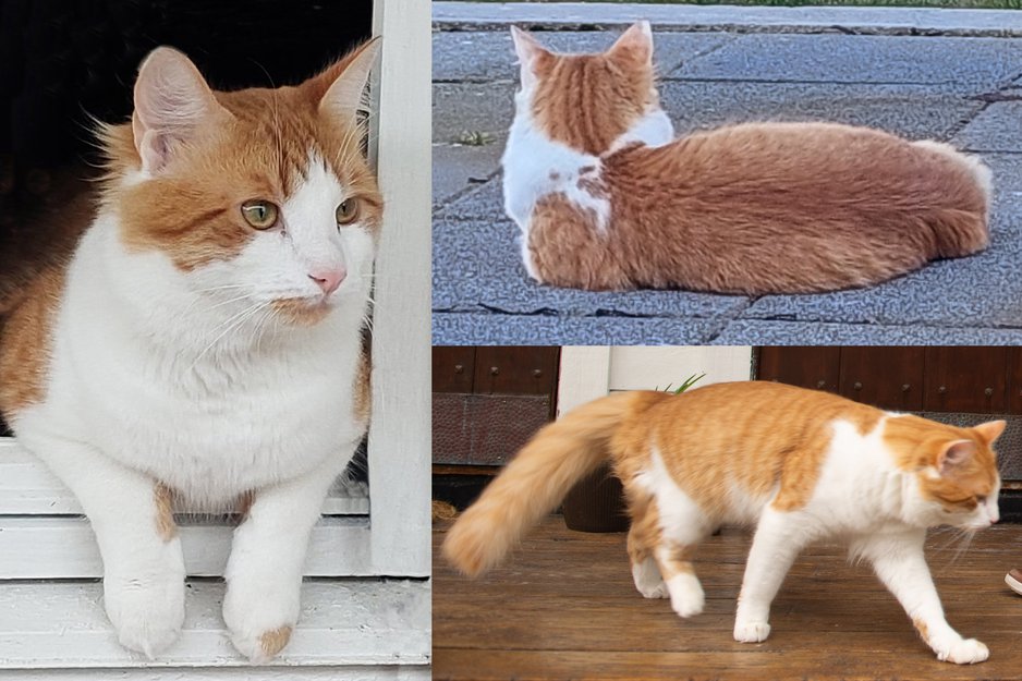 Han har en liten hvit flekk ved ene øret. 2 orange flekker i nakken og 2 ved munnen. Hvite labber med orange flekk på begge framlabbene. Stor fluffy hale. Rolig og snill katt som er veldig glad i kos.