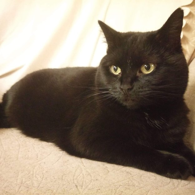 Liten hunnkatt, korthåret, myk, svart pels, rundt ansikt, liten snute. Et bittelite hakk øverst i hennes venstre øre. Beskjeden
