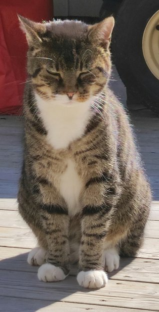Ett hvitt kinn, og ett brunt. Hvite felt på brystet og mellom forbena. Hvite poter. Ser litt muggen ut. Mjauer ved å si bææ