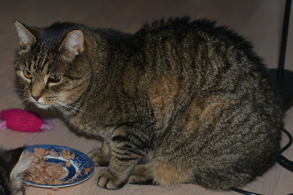 Han begynner å bli gammel og har mistet hørselen, og er derfor litt engstelig. Han er brun/grå stripete pels og har et hakk i høyre øre. Han liker å ligge ute og sove i solen/skogholt/mellom husene i nabolaget på Brånåstoppen. Vanligvis går han ikke langt unna hjemmet, men kan være borte 3-4 dager og komme hjem igjen.