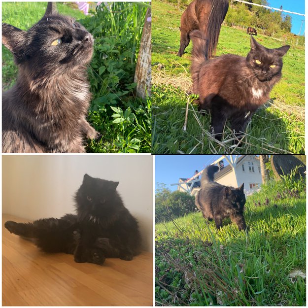 Hun har vært borte i ca. 2 døgn nå, ble sist sett 6. juni. Har lett etter henne overalt i området, men ingen tegn til henne. Det er veldig ulikt henne å være borte så lenge, og hun oppholder seg alltid i nærheten av huset vårt når hun er ute.