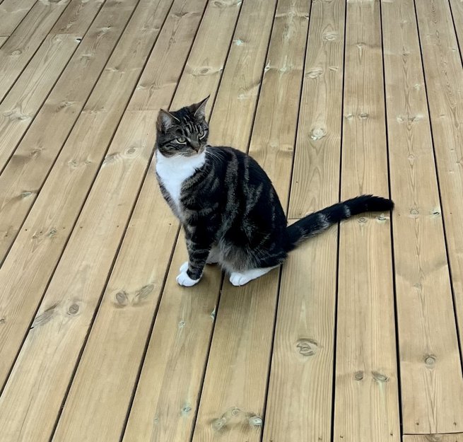Slapp ut katten tidlig på morgningen onsdag 7 juni og har ikke kommet tilbake. Hun er aldri lenge borte av gangen og kommer inn for å spise mat og slappe av inne i huset vårt.