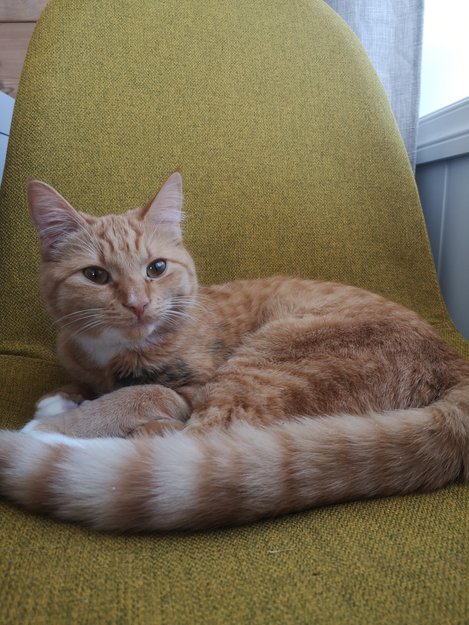 I hovedsak oransje med hvit bryst, mage og poter. Litt svart på høyre side (ser litt ut som hun har fått olje på seg). Litt liten og tynn, selv til hunnkatt å være.