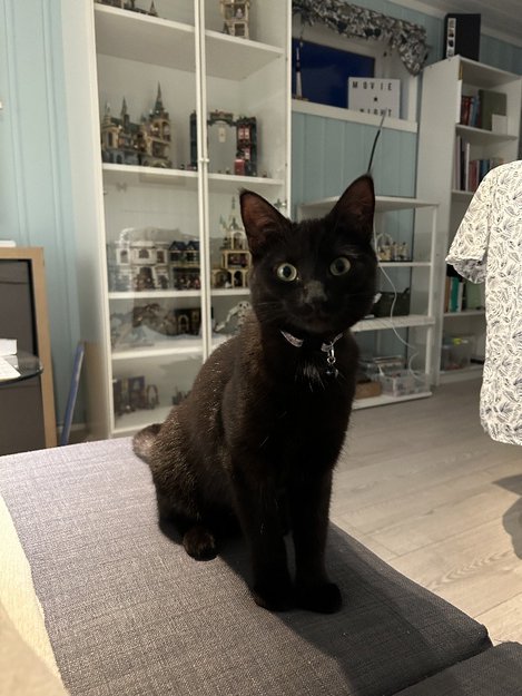 Hun har en hvit liten flekk på brystet og hadde på seg samme halsbånd som på bildet.