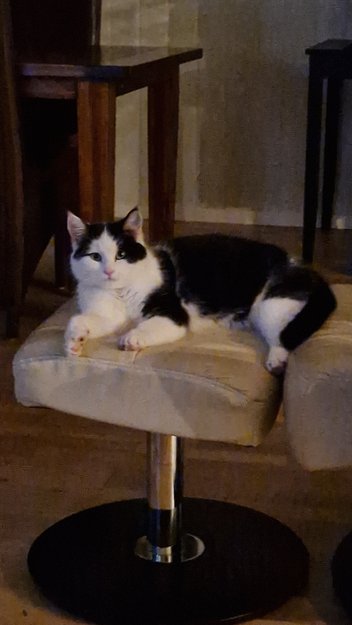 Mest svart oppå rygg, og 2-3 hvite flekker oppå der.