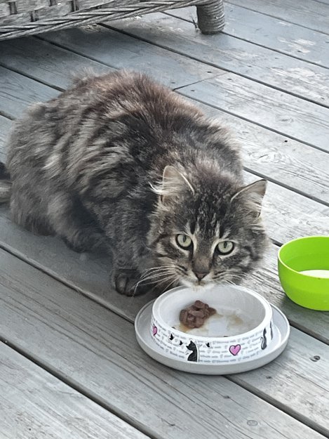 Denne katten har de siste ukene kommet til oss daglig. Sulten og redd. En langhåret og nydelig katt! Tynn og har mye floker i pelsen, kan se ut til at den har gått ute en stund. Går godt overens med husets hannkatt. Prater mye. Har forsøkt å finne chip, men har ikke lyktes så langt.