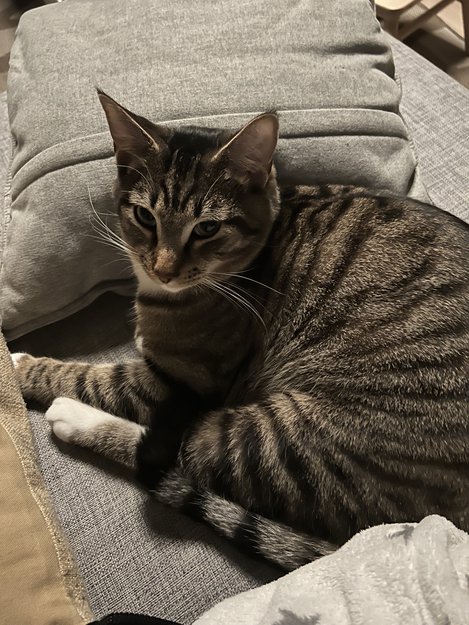 Han er en tabby katt, brun, svart, grå og hvit. Han har en hvit strek rundt øynene. Han er veldig nysgjerrig og sosial.