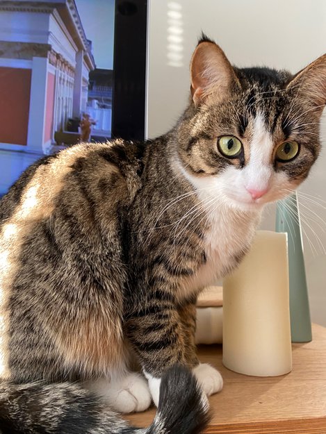 Hvit på kragen/brystet. Er godt voksen katt, men virker yngre, ikke så stor. I tillegg til eksklusivt navn, er hun sosial og spretten.