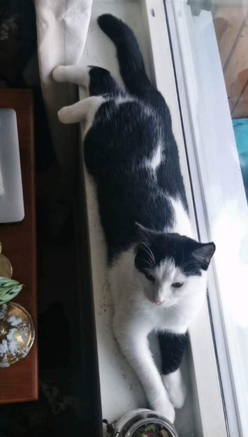 1 år gammel kattunge, lysebrune øyner svart flekk på nederste vannlinjen (høyre øyet), svarte og hvite markeringer rundt hele kroppen. Antydning til striper i det svarte på toppen av hodet om man kikker nøye etter.