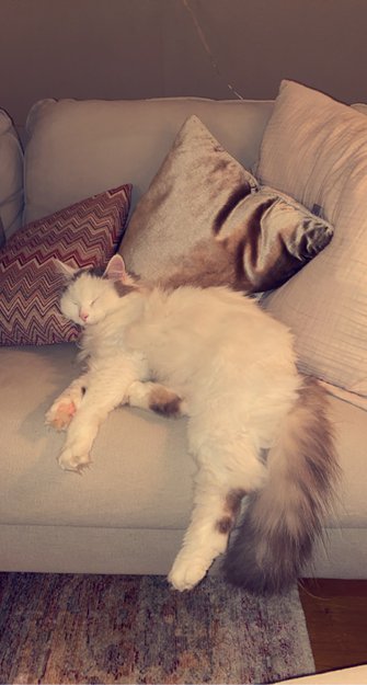 Hvit, langhåret. Litt grå og noe beige. Gule øyne. Litt skamklipt av mammaen sin.