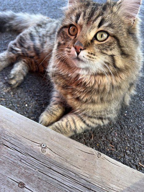 Stripet korthåret katt. Katten er ikke kastrert og ikke chippet. Dukket opp på Minnesund ved Påske tiden full av floker. Ikke redd mennesker