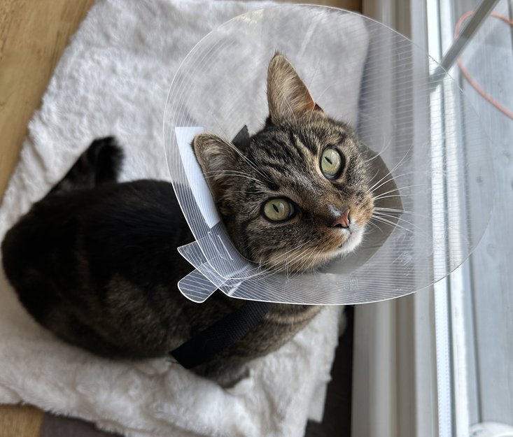 Kasper ble skremt av en høy lyd og kom seg ut. Han er vant til å være ute på dagtid, men har vært inne en stund grunnet skade. Han har krage og en skade/sår på oversiden av venstre ben. Han er kosete og glad i folk. Mulig kragen har falt av…