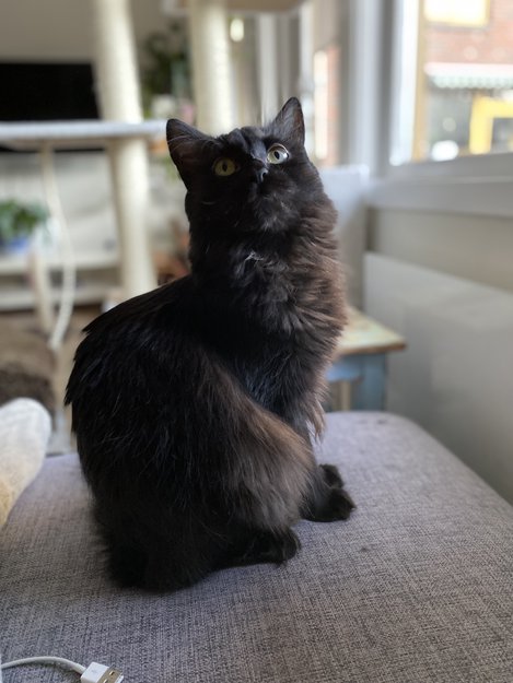 Sort (svart) halvlang pels. Noen få lange hvite hår på halen. Gule øyne. Hun maler veldig høyt. Hun hadde på seg et halsbånd da hun forsvant.