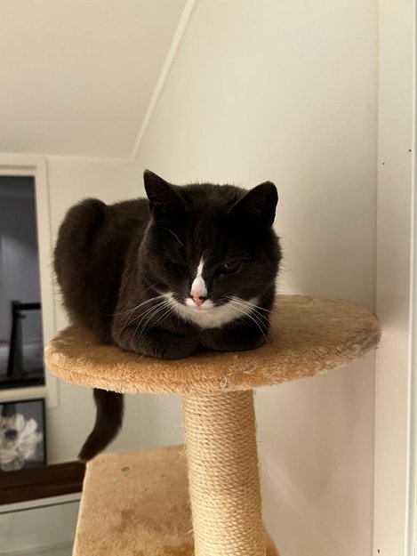Grå katt med hvit nese, mage og hvitt på potene. Ganske sky, men veldig kosete.