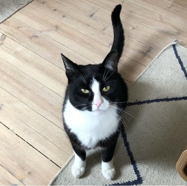Svart med hvite sokker og hvitt bryst og snute. Kontaktsøkende og lar seg klappe av fremmede.