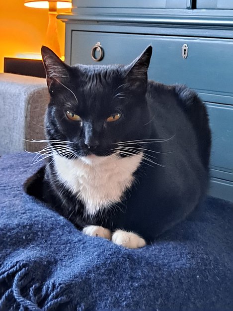 Hun er mest svart (helt svart nese), men har hvit hake og hvitt på potene. Gule øyne. Slank. Litt skvetten.