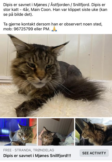 Dipis er savnet i Mjønes / Åstfjorden / Snillfjord. Dipis er stor katt - 4år, Main Coon. Han var klippet siste uke (kan se på bilde det).