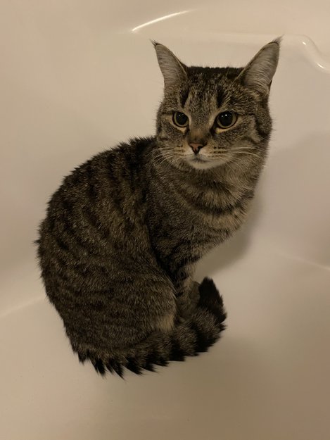 7 år, hunnkatt, sort og grå spraglete, litt brun på magen, sorte tegninger i fjeset, og litt pels som står rett opp på tuppen av ørene.