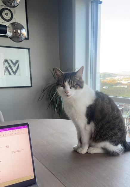 Han har en brun flekk under haken, men mest på høyre side. Han er hvit på alle potene, og oppover frambeina til ryggen. Han har en tatovering i øret, er chippet og kastrert.