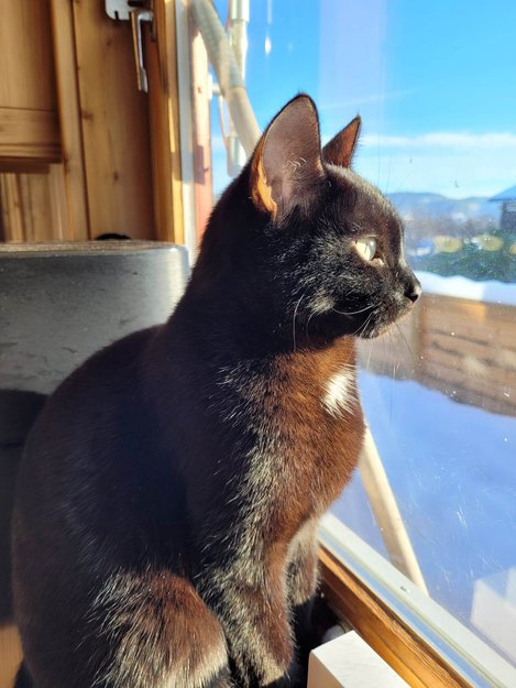 Sort, liten, korthåret, litt hvit på brystet, knekk på tuppen av halen, en lang klo på venstre bakpote.