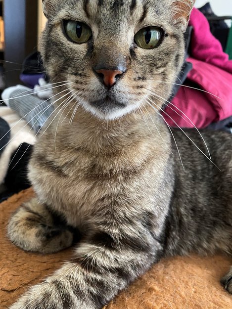 Hannkatt som kun har vært på ny adresse i 2 uker. Presset seg igjennom et vindu som stod på gløtt og hoppet ned fra andre etasje. Området er helt ukjent for pus. Han er litt redd høye lyder, men er menneskekjær og liker å bli klappet på hode.