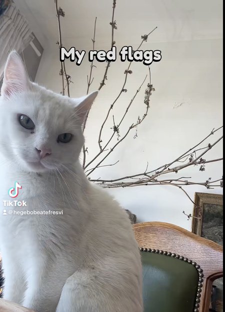Svart flekk i nakken. Kan mjaue litt rart. Hater å bli bært men kan gjerne følge etter folk på tur