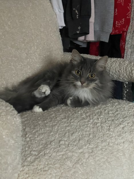 Er en grå hunnkatt med litt brunlige detaljer i ansiktet rundt snuten og hvite poter.