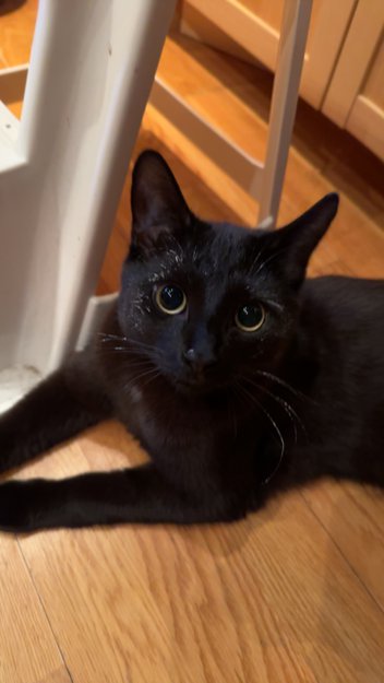 Sort hannkatt (innekatt) på ett år klarte å komme seg ut for første gang. Ikke kjent i området men kjenner forhåpentligvis lukten her og kommer hjem.