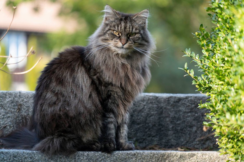 12 år gammel hannkatt med ett ganske "strengt" blikk og grå-spraglete halvlang pels.