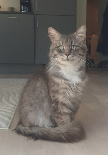 Stor katt med grå og hvit langhåret pels. Noe brunt i pelsen også. Mangler litt pels i visse områder, halen e litt tynn enda. Grønne øyne ❤