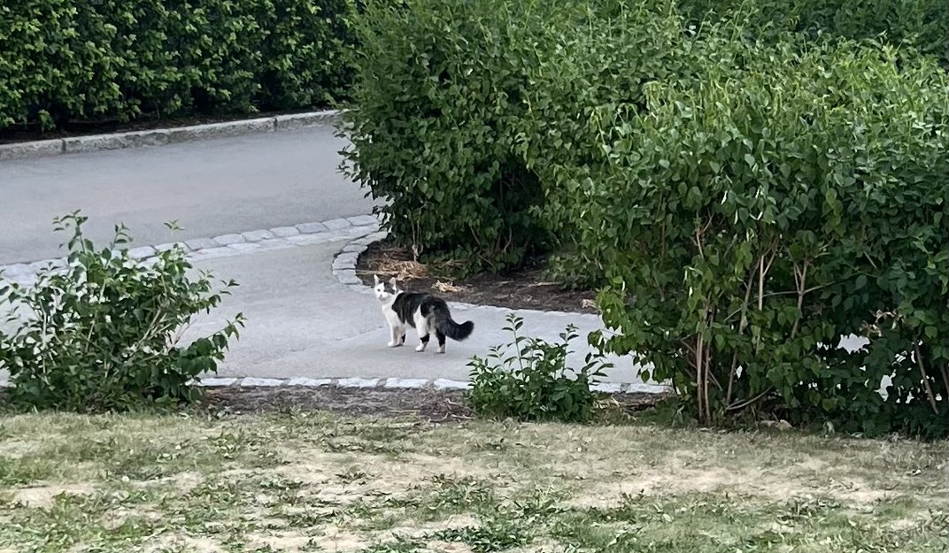 Oppsøkende, men redd katt med sele på seg går rundt i nabolaget. Har prøvd å klappe den, men den er skvetten.