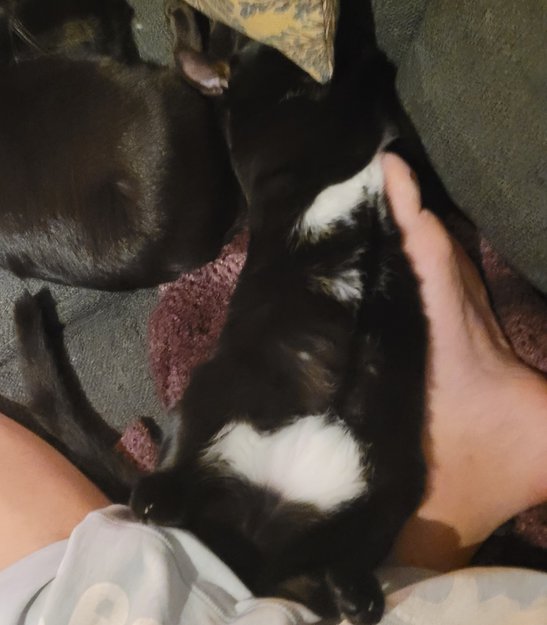 Liten svart hunnkatt med hvite flekker på bryst/mage, som vist på bilde.