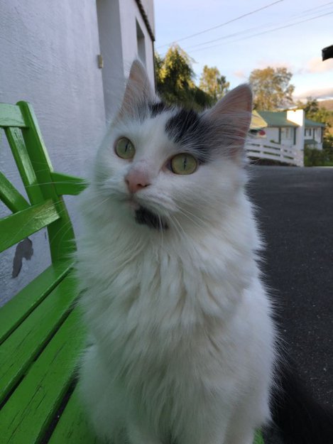 Hun har mellomlang pels, og en svært gjenkjennelig svart flekk på den ene haken. Svart hale, svart flekk mellom ørene og svart flekk på ryggen, og på ene bakbenet. Liten av størrelse og ganske lett, men hun er en godt voksen dame. Er ikke spesielt redd for mennesker, men liker ikke bli grepet etter eller holdt fast. Kan være redd dersom hun har skadet seg i fall.