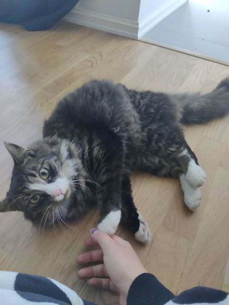 Er usikker, sulten og var av seg. Pelsen er flokete på steder og den kommer ofte dekket av støv. Er ikke sikker på kjønn, men den har en veldig skjærende mjauing. Virker mager og har en del kutt i ører.