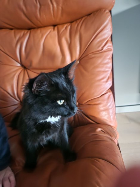 Ni er sort med en hvit flekk på brystet. Hun er en spretten, tillitsfull og nysgjerrig ungkatt på 9 måneder.