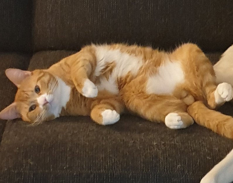 Han har ganske nylig blitt kastrert og det ble en litt større operasjon, så han har sår/sting på magen. Han er ganske liten for alderen og han har en oransje markering på høyre side av snuta, mens resten av området er hvitt.