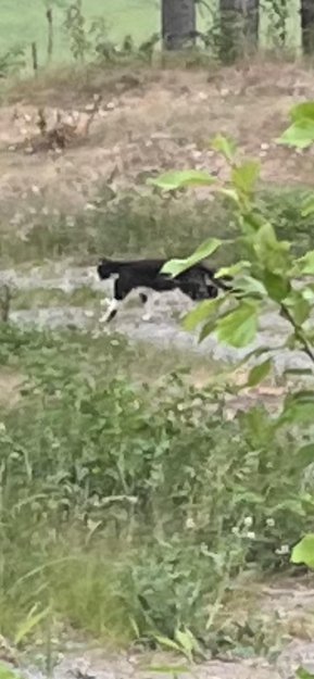 En sort og hvit katt ser ut til å oppholde seg i skogen rundt huset vårt. Vi ser den med jevne mellomrom, noen ganger daglig. Den er veldig sky - vi har ikke sjans til å komme nær den.