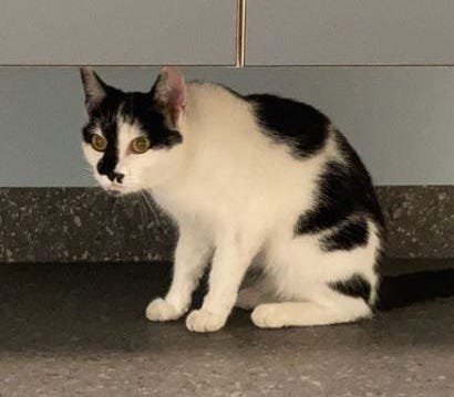 Sort hvit korthåret usikkert om hun er sterilisert, ingen chip.