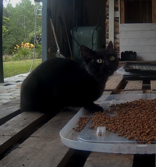 Vi har begynt å få besøk av en helt svart katt med kort hale, når vi prøvde å få tak i to andre hjemløse katter her. Vi reiste på ferie rett etterpå, så vi satte ut masse mat og kamera i tilfelle den kom og trengte mat mens vi var vekk. Har vært her hver dag siden.