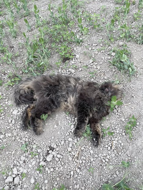Katt funnet på jordet. Var ikke chippet og hadde bitemerke i nakken. Vet katten har gule øyne siden den har vært på besøk tidligere.