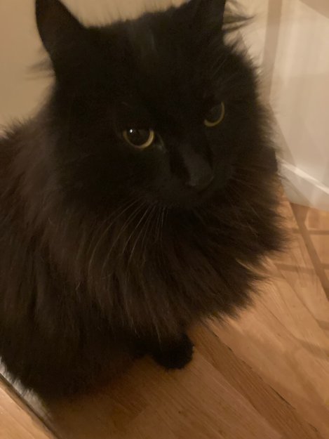 7 år gammel, rolig hannkatt. Klippet bort et felt med floker på høyre side (tror vi det var).